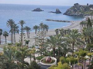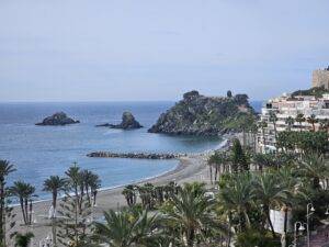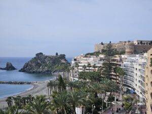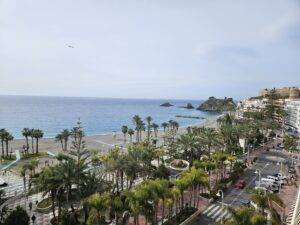 Desde la terraza, que es bastante amplia, tendrás el privilegio de admirar unas inigualables vistas a la playa, al mar, al hermoso y ajardinado bulevar del paseo marítimo, al peñón del Santo, al Castillo de Almuñécar.